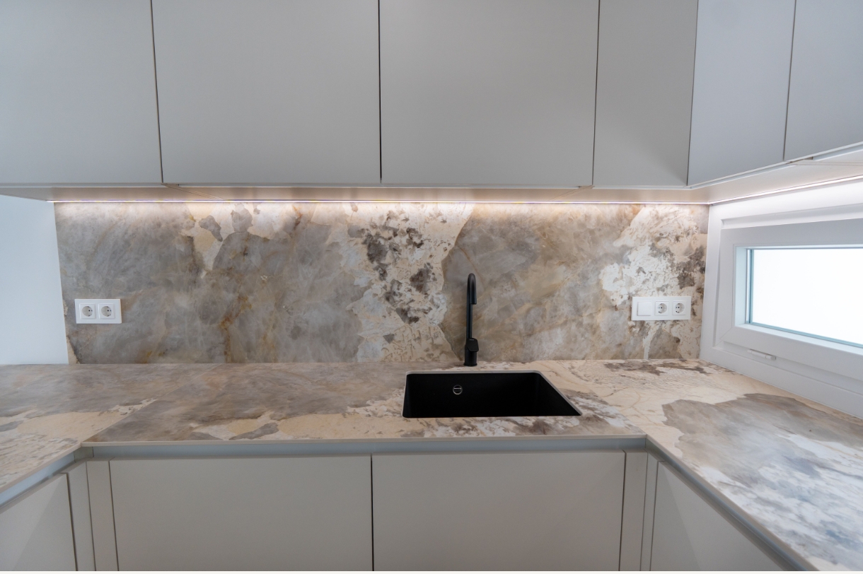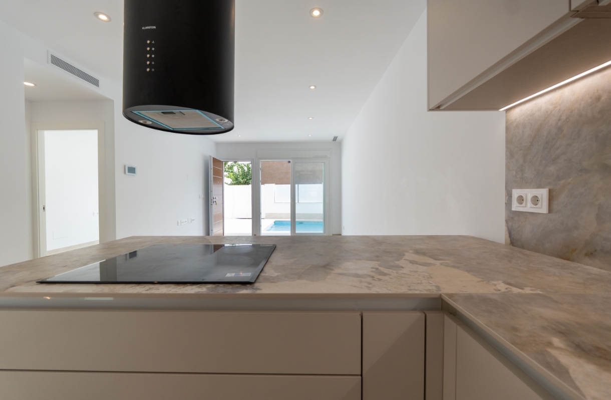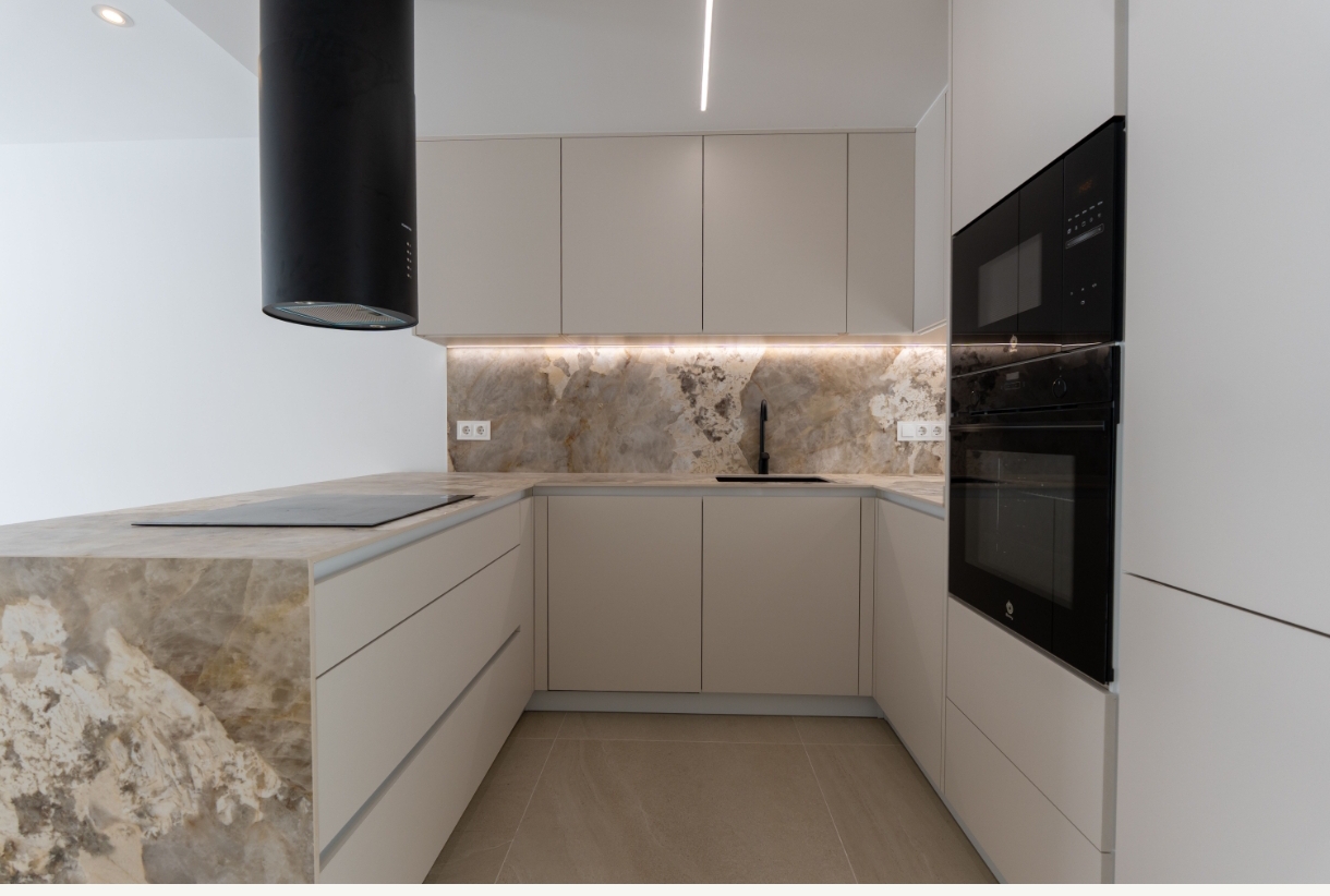 * Cocina moderna de concepto abierto, totalmente equipada con electrodomésticos de última generación.